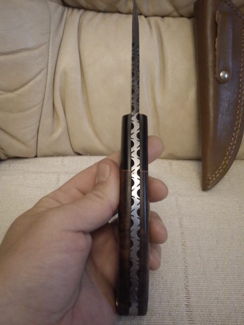 Сегодня у меня пополнение - вот такой вот небольшой ножичек из украинского дамаска и карельской березы. Сфотографировать достойно не получилось.