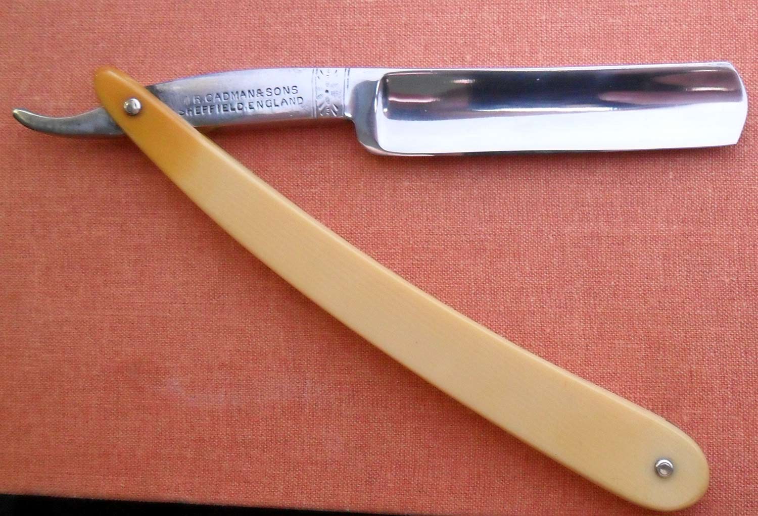 Сведения о производителе: http://britva.ru/articles/producers/cadman.php" onclick="window.open(this.href);return false; Ручка - целлулоид, имитация слоновой кости, в отличном состоянии. Ручка, пины и клинышек, по-видимому, родные. Заточена и полностью готова к бритью. Ширина полотна 17 мм, толщина в обухе 5,5 мм.