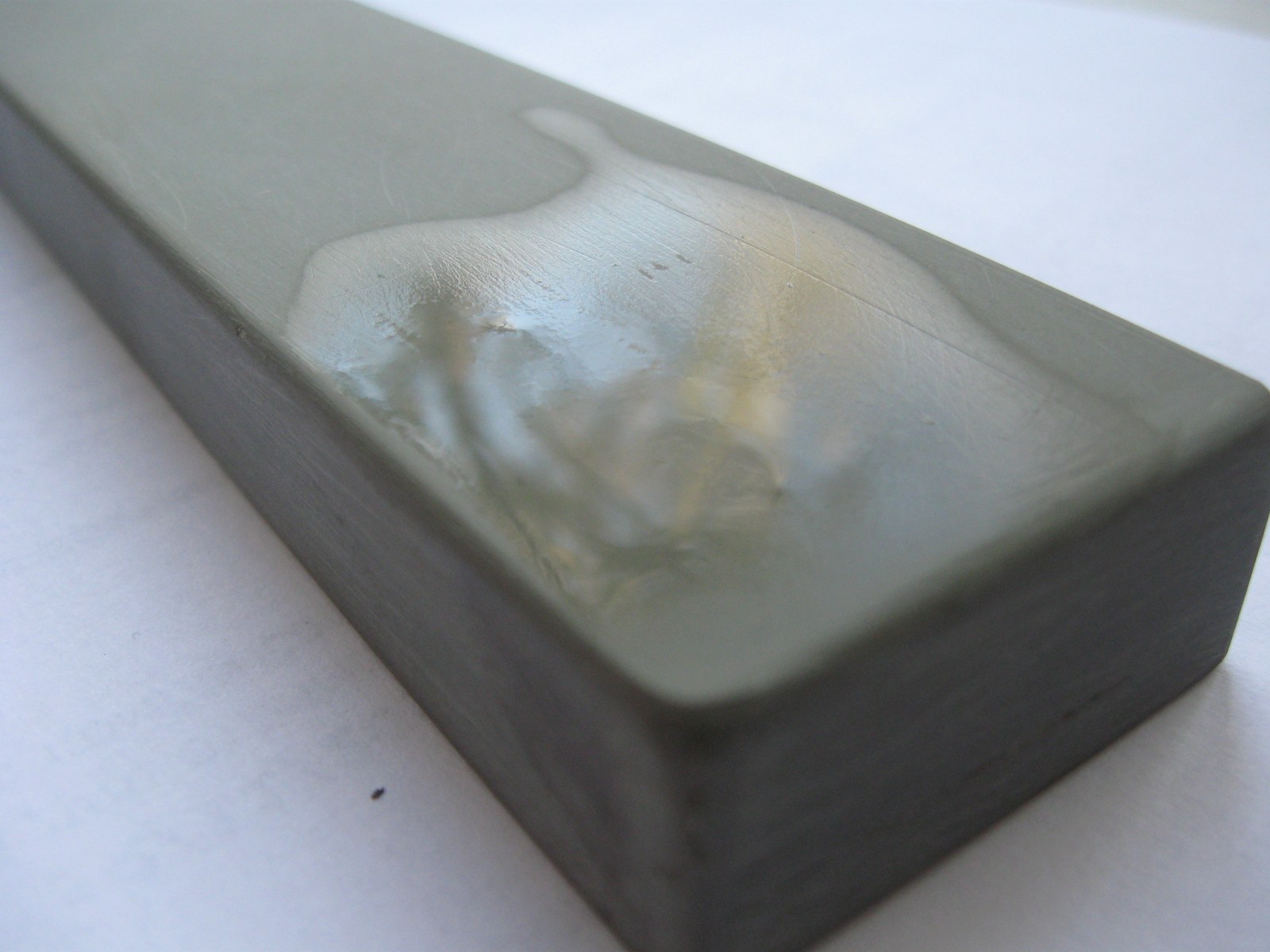 1) тяжеловатый 2) не пускает пузырей в воде 3) имеет ,довольно плотную структуру 4) на мог взгляд "мелкозернист",ближе к финишным камням. На "поцарапаность" поверхности ,не обращайте внимание.Камень будет ,еще доводиться. Специально смочил край камня водой,чтобы был виден контраст. У кого какие мысли или предположения?Заранее спасибо. P.S.Немного переделал фото.