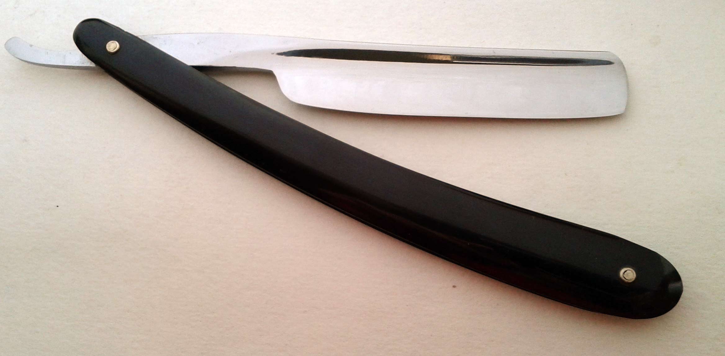 Ручка - эбонит, клинышек из металла. Клинок довольно близок к заводской геометрии, весьма мало был в использовании. Заточена и полностью готова к бритью. Ширина полотна 19,5 мм, толщина в обушке 5,5 мм. Цена 75 евро, доставка включена.