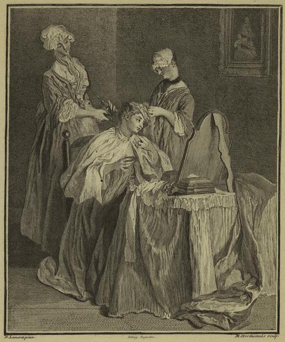 Louise-Magdeleine Horthemels Woman having her Hair Styled (гравюра по картине Никола Ланкре)