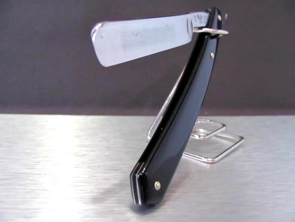 Параметры: ширина полотна 14 мм, обух 4 мм. Примечание: ручка из целлулоида, одна сторона немного искривлена ( от времени или температурного воздействия), ручка закрывается плотно (заменен осевой пин), полотно имеет легкие следы времени, бритва полностью вычищена, продезинфицирована , наточена. Цена 20 евро. L.V. Show