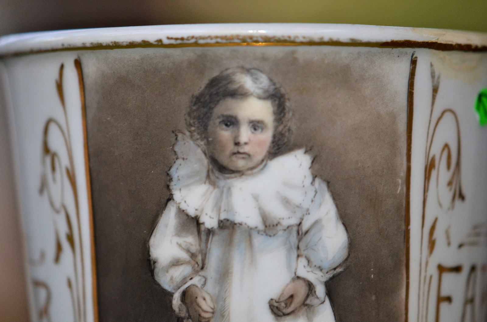 Fantastic photographic shaving mug of young child shaving mug. Mug is 3 and 5/8" tall, Hegner Barber supply mark on bottom out of Minnesota and Limoges markings. Came out of an old collection of shaving mug. Small old repair on rim to right of photograph, several photos showing repair, and a hairline in the handle, the handle has not been broken off, just a hairline only. Great large and clear image.