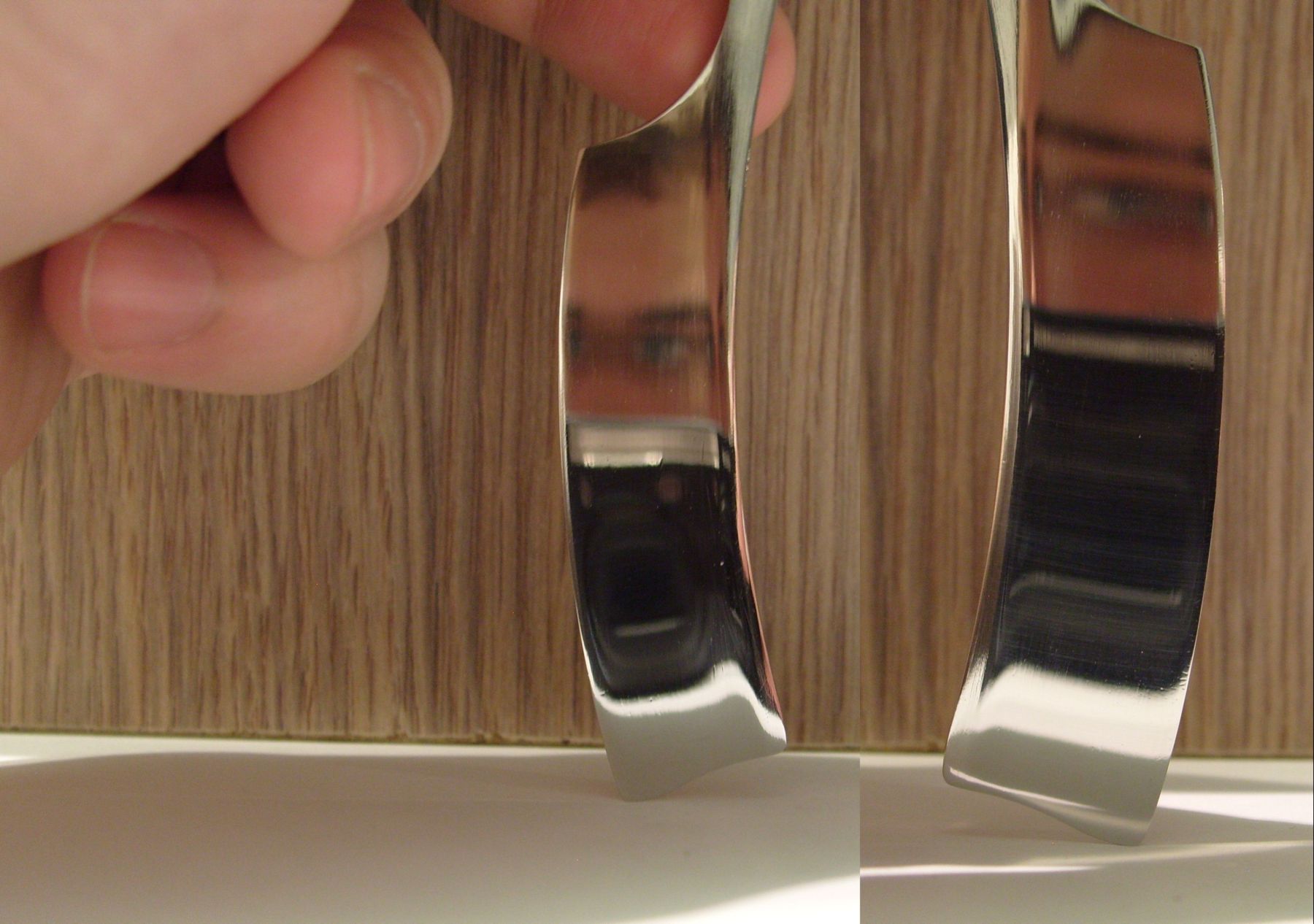 После чего я решил ее закалить заново... И конечно же тонкое сведение повело и оно стало волнистым... После чего, все было отслесарено заново, снята поведенная часть, обезуглероженный слой, сделаны новые спуски и несколько выровнена "улыбка", так как точить улыбающуюся бритву достаточно сложно. Теперь бритва узкая 12мм... Но твердая и хрупкая... Я пробовал ее отпустить в кипящей воде, но безрезультатно... она режет стекло... Бриться пробовал, заточилась до строгания волоса, но бреет не лучше чем в первый раз... Я полагаю что кромка просто выкрашивается... Кстати бреет намного жестче чем первый вариант... Сейчас нашел единственный вариант сделать правильный отпуск. Это раскаленное свиное сало, доведенное то точки дымления, которая равна 180 градусам по цельсию. Держал ее в этом масле на медленном огне, под вытяжкой чуть больше часа, масло немного поддымливало постоянно. Увеличивая огонь масло начинало дымить сильней. На газовой плите не сложно найти эту точку дымления... Остывает сейчас на воздухе.... Что получится, отпишу позже... Не получится так не получится... Я уже себе на еБее заказал старую но не пользованную бритву из Золингена.... Некоторые вещи не стоит воспринимать буквально...