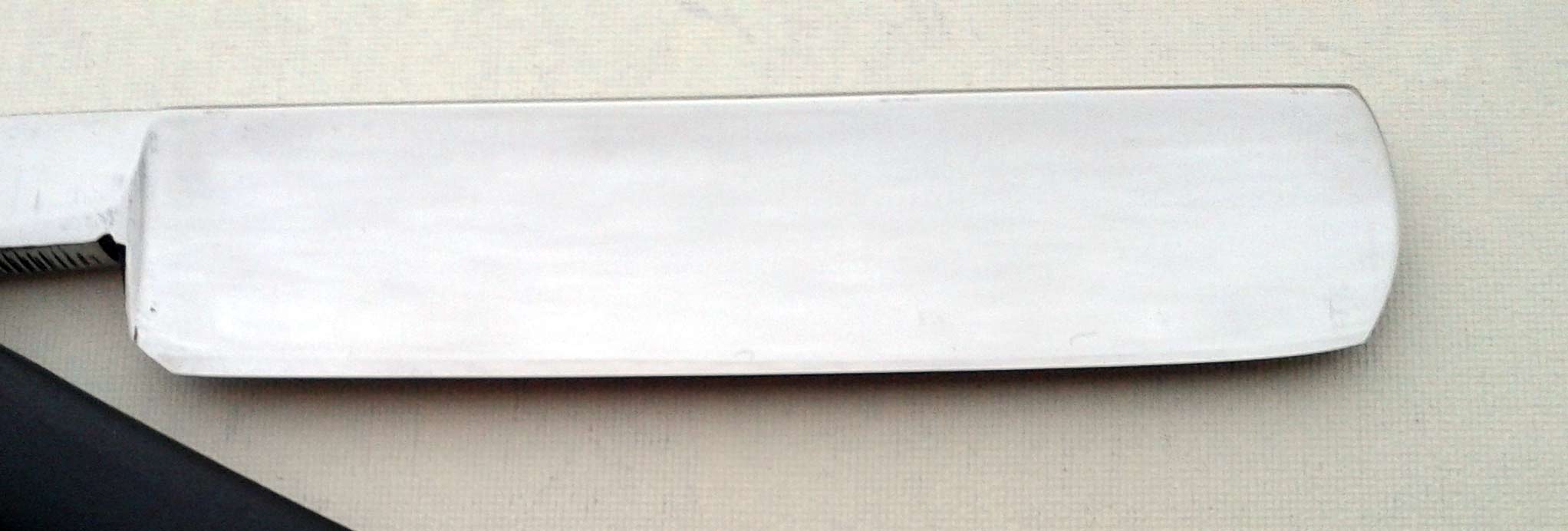 Видимо, бритва от интернациональной (Англия-Германия) фирмы типа KROPP. Ручка из целлулоида, в хорошем состоянии. На полотне имеются "следы времени". Возле обушка канавка неизвестного происхождения. Скорее всего - так называемый "заковыш", образовавшийся при изготовлении металлической заготовки. В любом случае, функциональность бритвы никак не затрагивает. Заточена и полностью готова к бритью. Ширина полотна 16 мм, толщина в обушке 4 мм.