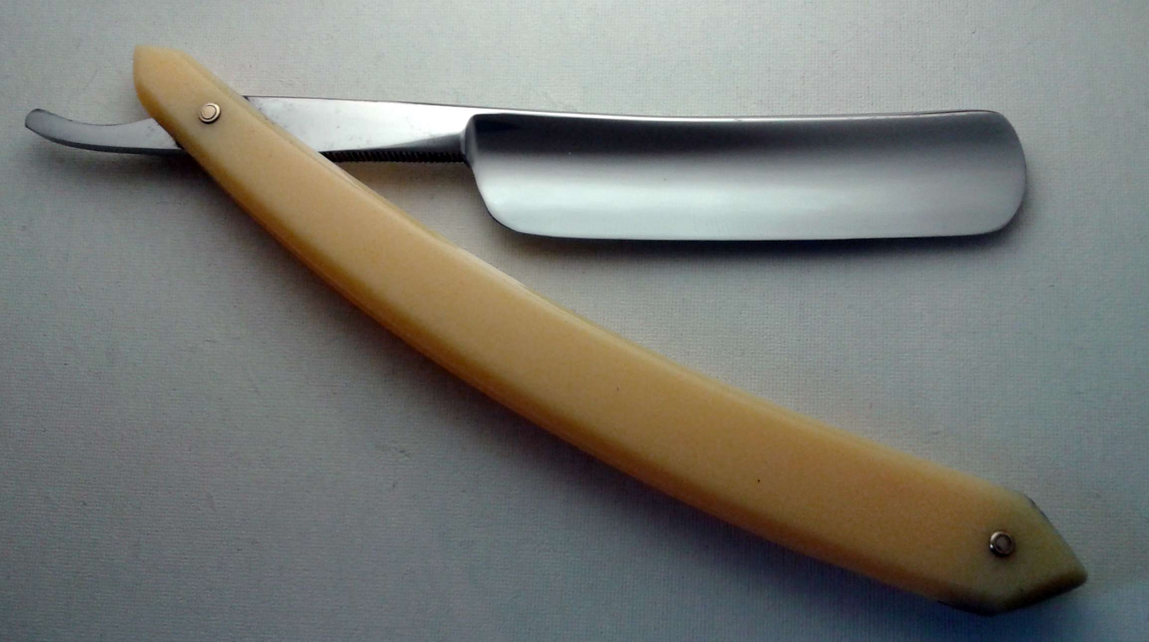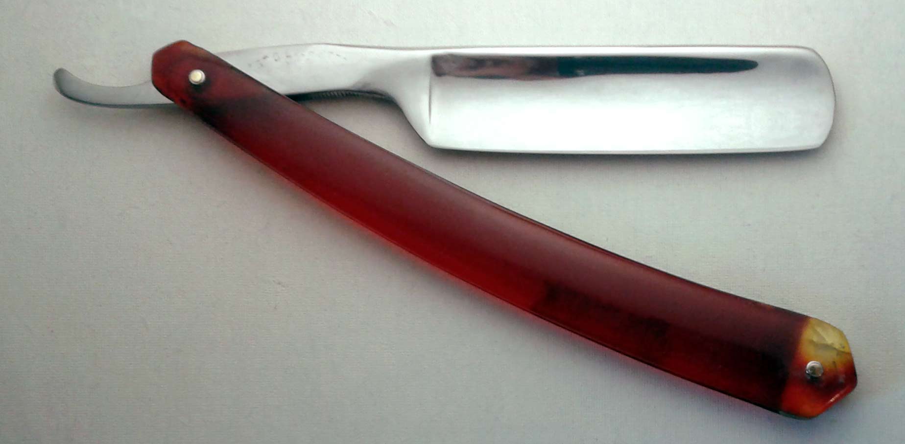 Видимо, бритва от интернациональной (Англия-Германия) фирмы типа KROPP. Ручка из целлулоида, в хорошем состоянии. На полотне имеются "следы времени". Возле обушка канавка неизвестного происхождения. Скорее всего - так называемый "заковыш", образовавшийся при изготовлении металлической заготовки. В любом случае, функциональность бритвы никак не затрагивает. Заточена и полностью готова к бритью. Ширина полотна 16 мм, толщина в обушке 4 мм.