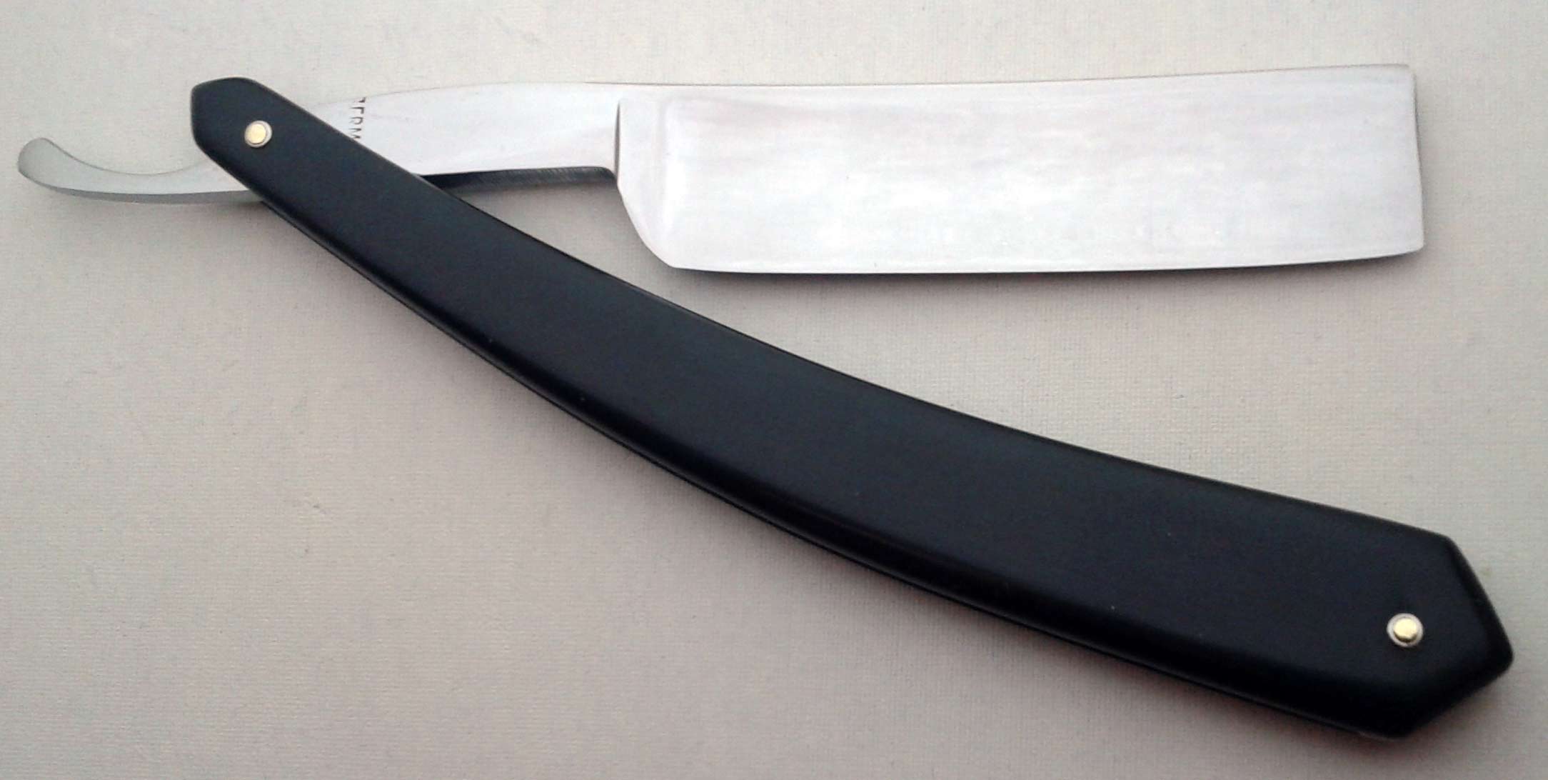 Бритва произведена в Шеффилде (есть фото клейма MOILLIET&GEM'S SHEFFIELD http://www.bladeforums.com/forums/showt ... eld-Dagger" onclick="window.open(this.href);return false;). Ручка - эбонит. Заточена и полностью готова к бритью. Ширина полотна 17 мм, толщина в обушке 5 мм.