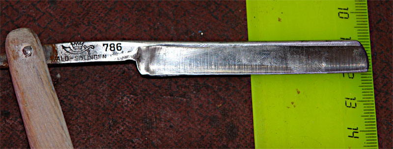 Что было нужно сделать, так это воссоздать сначала изогнутую выпуклую РК (режущую кромку), повторяющую линию обуха, а затем точить бритву уже с поправкой на её изгиб. Вывод: прежде чем браться за серьёзные переточки, установите не имеет ли обух слабого изгиба. Сильный виден и так, а слабый практически незаметен. И между прочим, сейчас, при наличии печального опыта я с этого начинаю и обнаружил, что на некоторых советских бритвах такая геометрия задана фабрично. Недавно купил Труд Вачу 54 года, у которой линия обуха от хвостовика идёт по прямой, а ближе к носику сантиметра два изогнуты, как шашка. Аналогичная геометрия наличествует и на одном имеющемся у меня Вейд энд Батчере. Re: Обратная улыбкаERN Wald Solingen 786. В этом разделе выкладывал ее фото со сколами. Изначально была, вероятно,4/8. Сточил до 3/8. Бритва в работе. Особенно не ругайте.