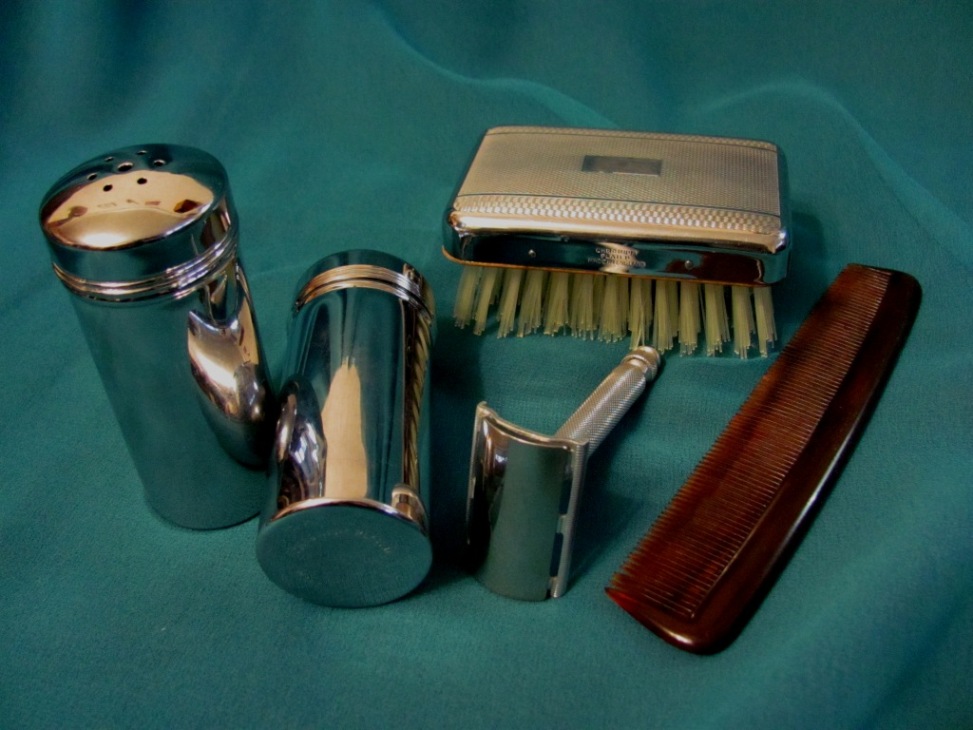 Все в приятной сохранности, щадящая эксплуатация была. В наборе : 1.Станок Gillette ( как новый) 2.Щетка для одежды ( крепкая щетка, волоски все на месте 3. Расческа ( все зубы на местах, пластик цветом под рог сделан). 4. 2-е емкости, видимо под мыло и помазок ( внутри есть следы от окисления). 5. Футляр из кожи, коричневого цвета ( для его лет, выглядит достойно). Предметы все вымыты, продезинфицированы, готовы служить дальше. Цена 50 евро, доставка включена. ПРОДАН. несессер Show