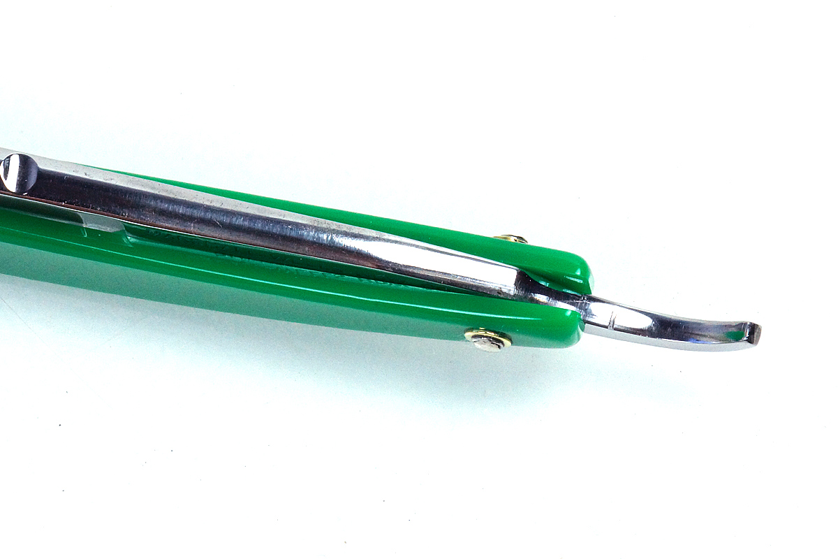 Целлулоид старенький, но как оказалось крепкий, решено было ручку не менять, вычистил, выровнял накладки, вклеил на место. Полотно виды видало, но сталь хорошая, чувствуется "старая" школа производства.