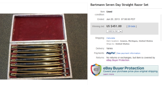 Re: Kronenberg SolingenНаборы в таком состоянии и от неизвестного производителя не могут столько стоить. В наборах бывают обычно 7 бритв(неделька), а тут целых 10 штук, видимо это не набор а подарочная упаковка. Если нет клейма производителя, то ценность не велика, если все целые бритвы, без потерь, то на Ебее может за 400 $ продадутся, а вот за 1000 $ , ой, я вас умоляю. Вот вам пример: http://www.ebay.com/itm/DOVO-VINTAGE-ST ... 9231919%26" onclick="window.open(this.href);return false; И ещё: Re: Kronenberg SolingenЖелание продать конечно есть, но не такое сильное (все мы немного люди алчные). В первую очередь хочется понять откуда данное чудо появилось, поскольку я знаю, что мой прадед занимался реставрацией антиквариата в 30 х годах, и имел внушительную коллекцию, которая, к сожалению, была либо разворована, либо конфискована в не лёгкие годы войны.