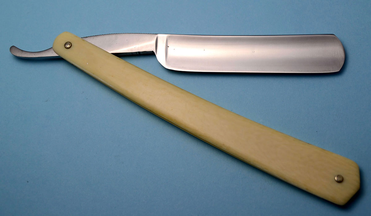 Ручка из кости, предположительно слон. На фото ручка получилась не очень похоже, в реале цвет более светлый и слегка желтоватый. Возле верхнего пина имеется трещина, заклеена цианакрилатом. При нормальном использовании проблем не будет.На фото ручка получилась не очень похоже, в реале цвет более светлый и только слегка желтый. Заточена и полностью готова к бритью. Ширина полотна 16 мм, толщина в обушке чуть меньше 4.5 мм.