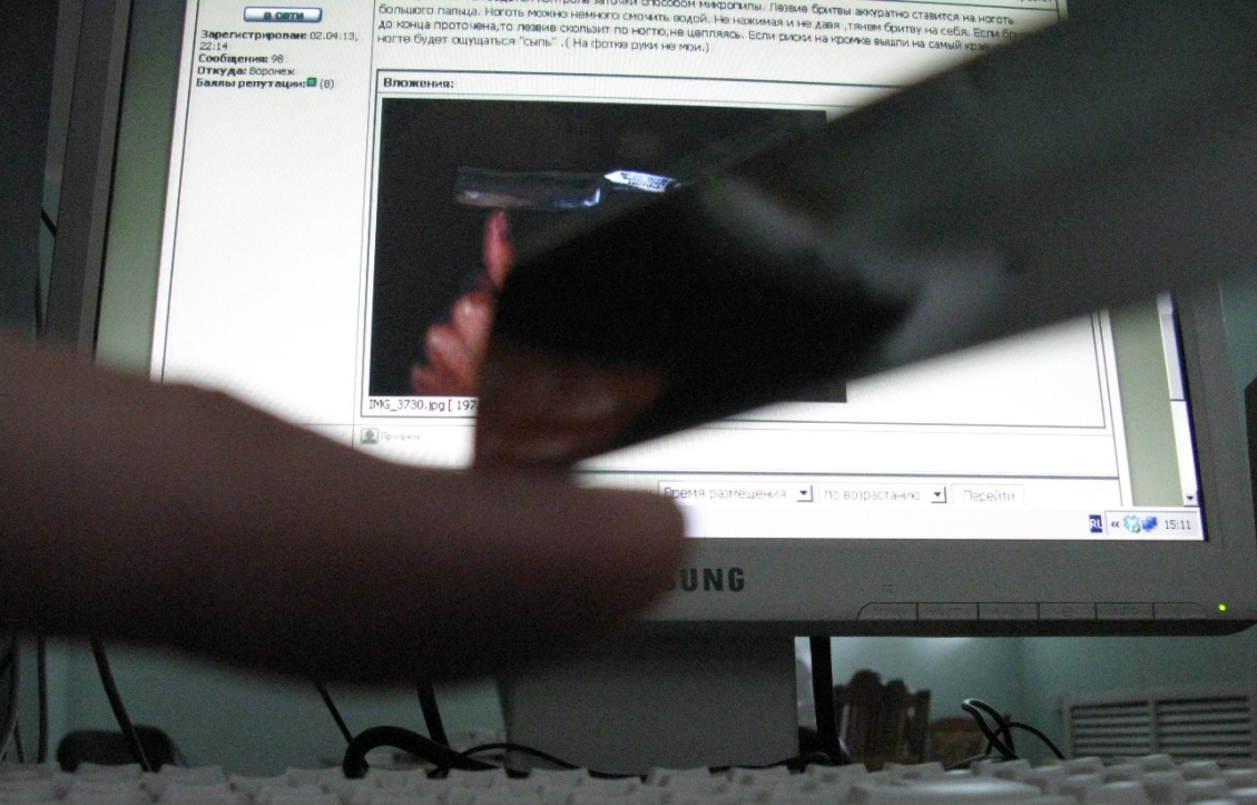 Re: Выбор камня или снова новичок (реальные отзывы)Примерно вот так ведётся контроль заточки способом микропилы. Лезвие бритвы аккуратно ставится на ноготь большого пальца. Ноготь можно немного смочить водой. Не нажимая и не давя ,тянем бритву на себя. Если бритва не до конца проточена,то лезвие скользит по ногтю,не цепляясь. Если риски на кромке вышли на самый краешек,то на ногте будет ощущаться "сыпь" .( На фотке руки не мои.)