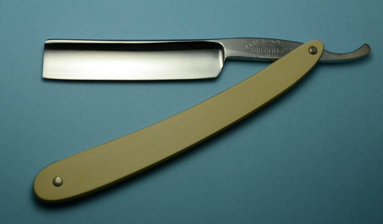 Ручка из кости, предположительно слон. На фото ручка получилась не очень похоже, в реале цвет более светлый и слегка желтоватый. Возле верхнего пина имеется трещина, заклеена цианакрилатом. При нормальном использовании проблем не будет.На фото ручка получилась не очень похоже, в реале цвет более светлый и только слегка желтый. Заточена и полностью готова к бритью. Ширина полотна 16 мм, толщина в обушке чуть меньше 4.5 мм.