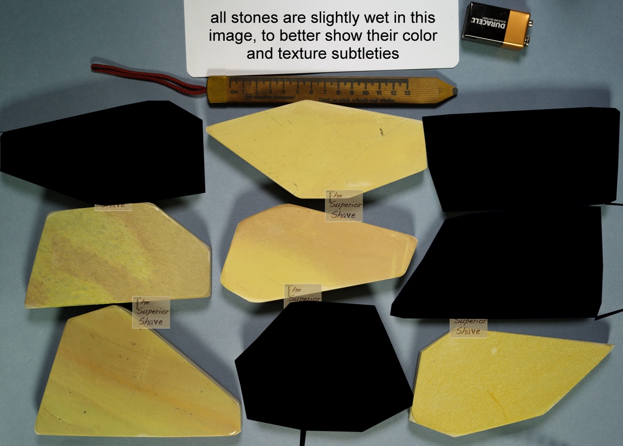 1. У Вас размер 40*150, но лучше бы 50*150-175, да? 2. У камней со скощенными гранями (с указанного сайта) кроме цены ещё плюсы есть? 3. Этот производитель использует для основы BBW? В тексте идет термин "наклеенный на шифер" (glued-on-slate ), что они имеют ввиду. 4. Камни очень разные по поверхности/рисунку - на фото 1 с левого края в крупную сетку (рисунок), второй справа - с крупными красными вкраплениями (чем больше гранатов тем же лучше или это вообще не они?) - на фото 2 слурри совсем другой структуры (видно что мелкое зерно), чем основные камни и называются "специальные". Этот вид слурри какой-то особенный? Мы же знаем, что слурри высвобождает из основного камня рабочее зерно гранта, а эти спешиал зачем? - на фото 3 котикула совсем другая - мелкозернистая, с рисунком и ярко-желтая - Ваш камень как будто из чешуек... - вообще видно, что многие камни не однородные по структуре, тогда как у винтажный равномерныt и цвет и структура (без выраженных включений) - см. фото 4 они (или конкретно coticule) как-то отличаются по свойствам, кто из них самый "правильный" (по идее тот который равномерный по структуре), и самое главное - на что ориентироваться новичку при выборе бельгийца на этом сайте (да и в общем), кроме как на целостность, размер/толщину желтого слоя и цену? Вон какие они разные. Спасибо всем откликнувшимся. Кстати, много образцов с трещинами)