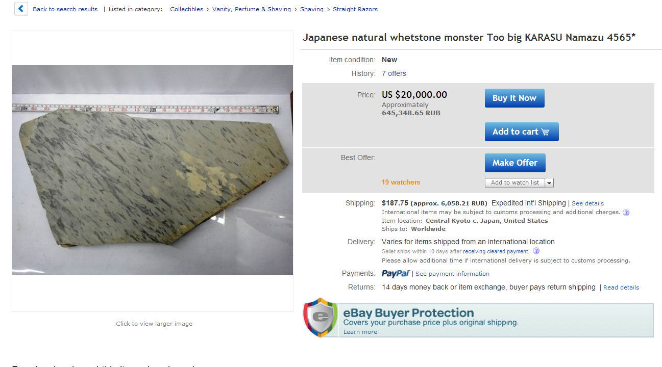 http://www.ebay.com/itm/Tennen-toishi-N ... 2eb7bacbeb" onclick="window.open(this.href);return false; Вот тут по случаю пару камешков продают. Хороши камушки, чего б не взять? Я бы взял, да мне картон стругать не надо. А так-то хороши, без вопросов. Re: Аукционы: плагиат, развод и "великолепные" описанияДа, и не постеснялся еще и на доставке добрать.