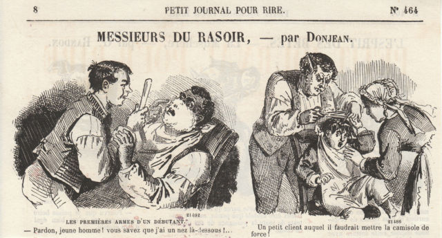 [Thomas Rowlandson (1756-1827)]. London, Published by William Holland, [1789]. Etching with aquatint. 789.0.59 BMCat 7605 The barber holds his bowl and soap and is watched with apprehension by his customer. Meanwhile, another man is stanching a wound over a basin, and the barber's helper irons a wig. On the floor and on the walls are wigs (including the customer's?), wig-blocks, and a razor.