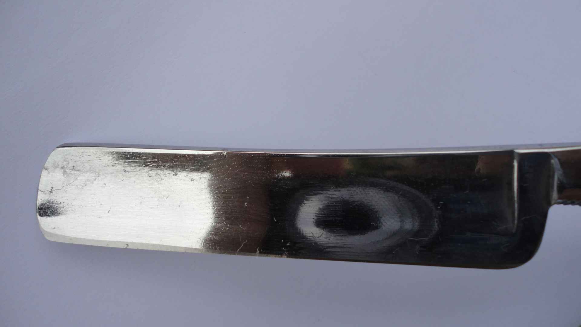 Приобрел бритву СТИЗ двухзаковную 1956 г.(коробка наверное не от нее, на коробке написано "особая"). Отполировал алмазными пастами с 14/10 до 0,5/0. На кромке были сколы и каверны, убрал их (смазал вазелиновым маслом). Теперь хочу окончательно заточить. Но не могу определиться, эта бритва с небольшой улыбкой или прямая? Если с улыбкой (ранее точил только прямые), то такой способ подойдет: Х-движениями сначала приподнимая слегка носок(протачивать пятку), а затем плавно переходя через середину и заканчивая приподнимая немного пятку. В первое время увеличивая давления на протачивании пятки и носика, т.к. сейчас кромка прямая. Или затачивать ее как прямую?