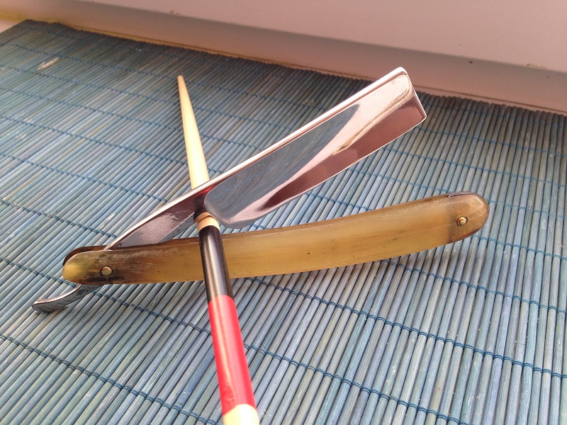 Ширина полотна 6/8 , оригинальные пины из латуни и ручка из рога . Заточена и готова к бритью .