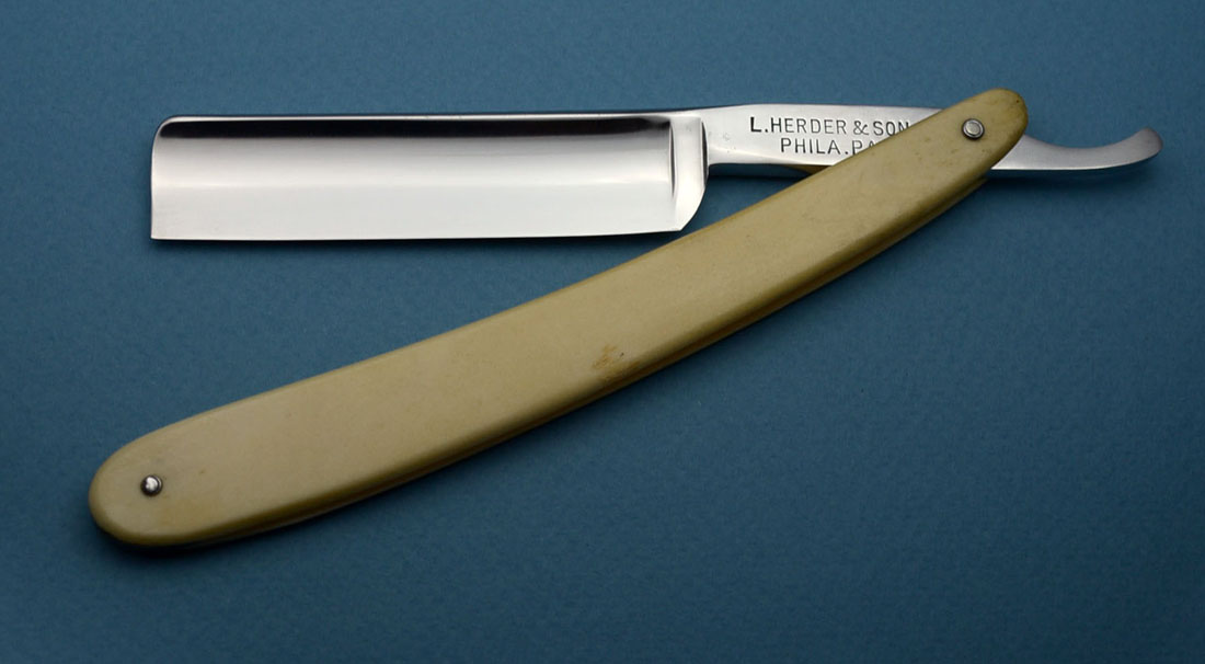 Насколько я понимаю, бритва изготовлена в Германии по заказу американской фирмы. Ручка из кости, в приличном состоянии. Заточена и полностью готова к бритью. Ширина полотна 19 мм, толщина в обушке 5 мм.
