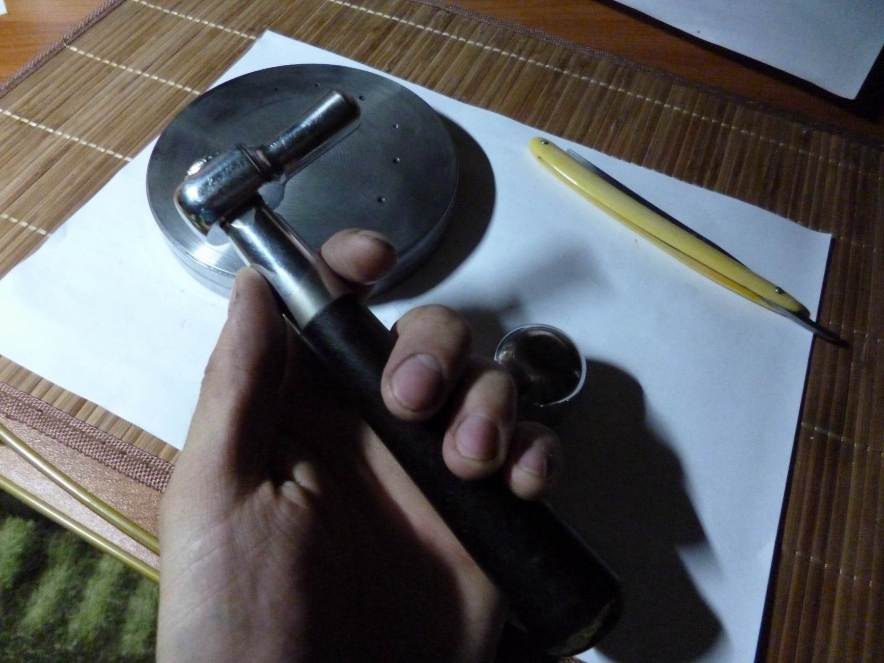 Большая наковальня и маленькая. Маленькая не совсем круглая, на верхушке сделал плоскость. Молоточек сделал из инструмента для настройки пианино. Ручка из текстолита. Достаточно увесистый, не смотря на внешний вид. Конечно можно было купить готовый молоток и обточить, но для бритв мне показалось надо что-то более интересное. ------------------- А вот и первый опыт использования. Первый блин комом, но как по мне получилось неплохо. Шайбы родные, пин из латунной проволоки. Осталось решить проблему с дефицитом шайб и прутков. Re: Заклёпки для опасных бритв и ремонт в домашних условиях.Вот такое До ми соль.