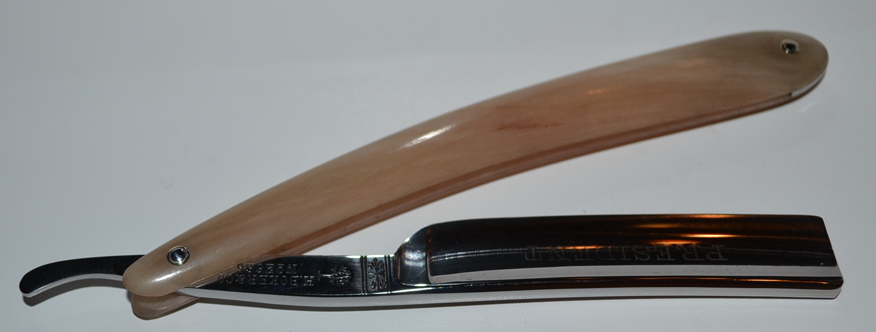 Цельный рог горного барана, тонирован, полирован.Клинышек как всегда, олово. Бритва H.Boker&Co №2666 Выпущена в годы правления Рузвельта.