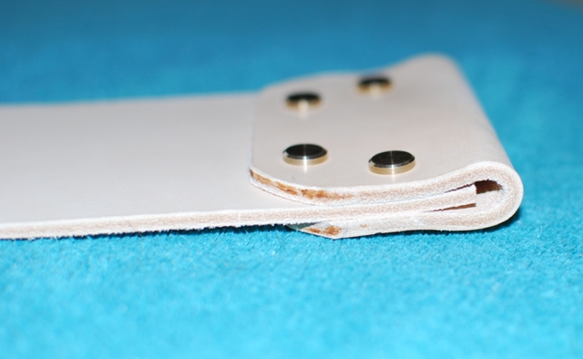 Скоба собственного производства из нержавейки 1.5мм. Карабинчик сделал крутящийся. Кожа шведский чепрак растительного дубления толщиной около 4мм (от мони). ------------------------------------------ Кому интересно могу изготовить по вашим размерам аналогичный.