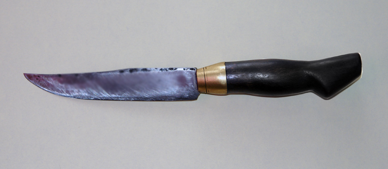 Лезвие 125 мм. Отковано из ржавой рессоры. Толщина у основания 5 мм и далее равномерно сходит на нет. Спуски прямые от обуха. "Больстер" из какого-то обточенного водопроводного переходника. Рукоять (120 мм) из тонированного корня ореха.