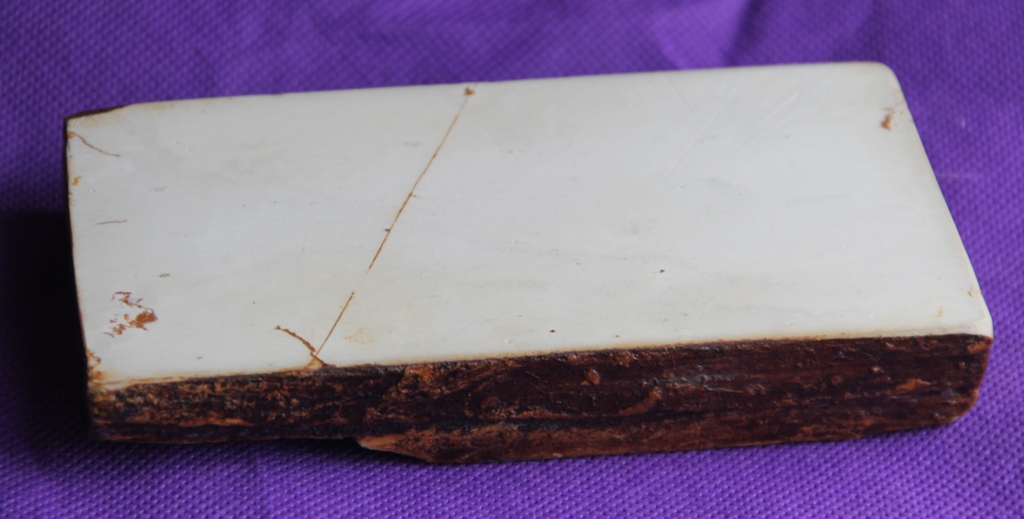 Камень имел одну прожилку пересекающую его под 45г и пару трещин скраю, с обратной стороны был не обработан что привело к продольному "горбу " не позволяющему положить его на плоскую поверхность - исходя из этого камень был распилен, отпилен край с трещиной , задняя сторона была сточена и покрыта лаком, поверхность была притерта на шкурках и КК до F1200 - в результате получился камень приблизительно 140Х50Х10 - фото до и после в конце топика