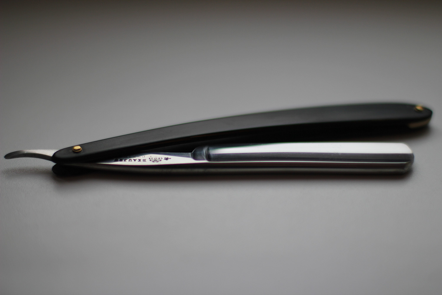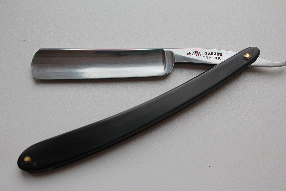 ПРОДАНА Spoiler Show Франция. Вогнутость 1/2. Ширина полотна 4/8. Ручка рог, родная. Пины латунь. Заточена и готова к бритью. Качество бритья в лучших традициях французских бритв .
