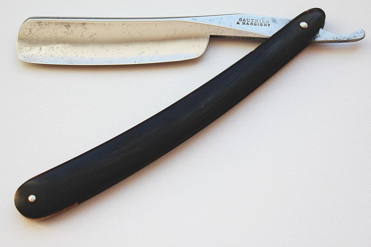 ПРОДАНА Spoiler Show Франция. Вогнутость 1/2. Ширина полотна 4/8. Ручка рог, родная. Пины латунь. Заточена и готова к бритью. Качество бритья в лучших традициях французских бритв .