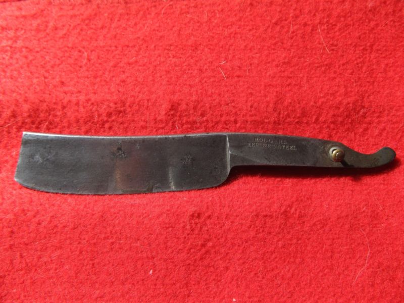 Шеффилдский клин ( небольшая вогнутость полотна присутствует, но она даже на квартер холлоу не тянет) "Rodgers refined steel". Какой из двух ветвей семьи Роджерс была выпущена эта бритва, остается загадкой, однако учитывая отсутствие слова sheffield на клейме, можно предположить, что сделана она была в первой половине XIXв. Оригинальной ручки не сохранилось. Учитывая размер (7\8), форму и массивность бритвы, новая ручка была сделана такого же типа как на батчеровских топорах "for barber's use". Материал - прессованный рог. Клинышек - олово. Шайбы - стальные батчеровские. Bart und Mantel machen den Philosophen nicht.