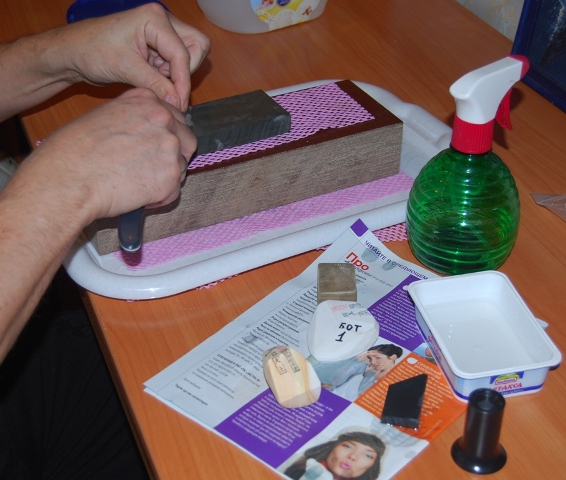 В положении сидя на табуретке клади на лядвии разделочную доску, а на неё — точильный камень.