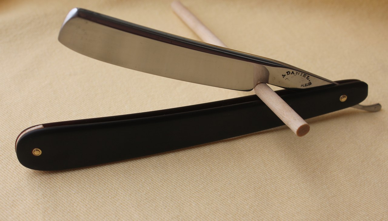 Старый английский клин в хорошем состоянии.Ширина полотна 4/8. Ручка кость, клинышек олово, пины латунь. Бритва заточена и готова к бритью