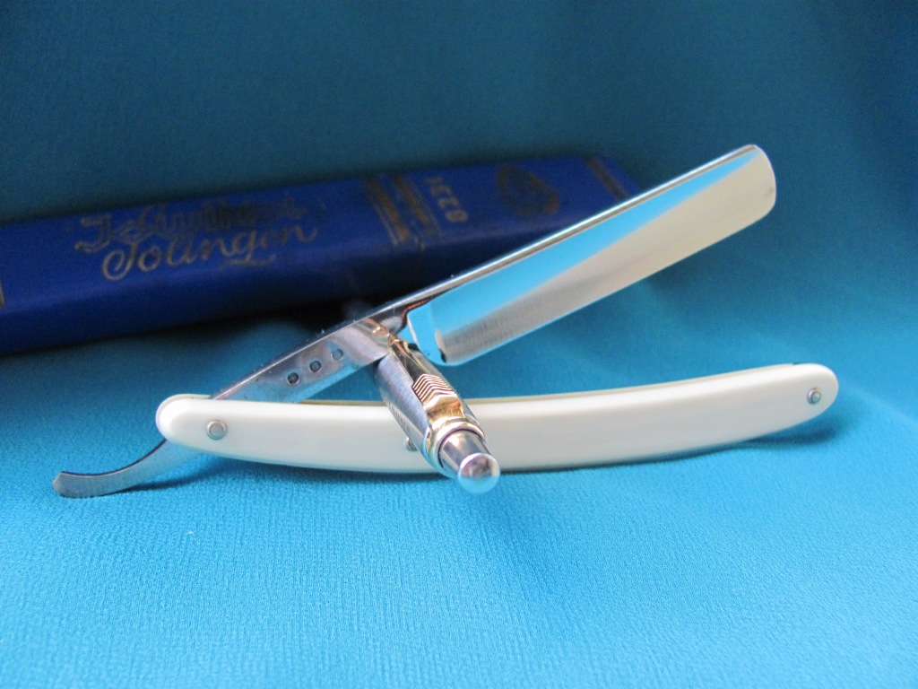 Производитель: J.A.Henckels. Twin Works. Solingen. Germany. Model 415 Размер: 5/8 ( а точнее ширина 16.5 мм.) Состояние: минимальное б.у., сохранность очень приятная, заточена и готова к бритью. Ручка из пластика, перламутровая, с медными наконечниками, одним словом -красивая. Цена: проданы близнецы Henckels Show