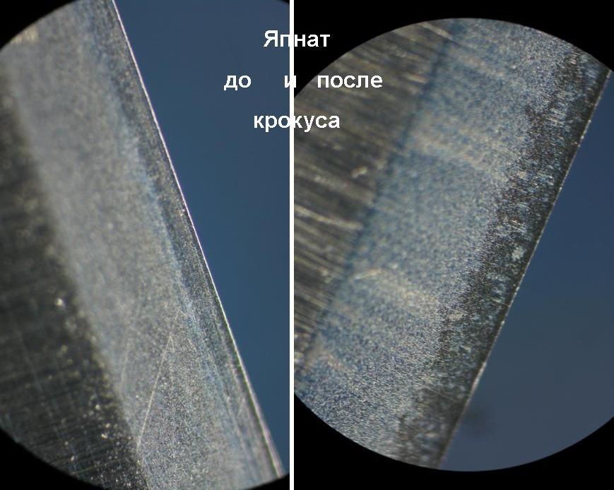 Низкое качество некоторых марок и последствия неумелого пользования данными абразивными средствами, совершенно обоснованно вызывают у многих брадобреев отторжение, однако абразивные порошки их производные – древнейшее и эффективное средство доводки режущего инструмента, которые должны быть в арсенале заточника. К сожалению, даже на специализированных технических форумах этот вопрос освещен расплывчато, а именно четкость представления о работе этих абразивов, да, в общем, и всех остальных, позволяет определить им место в сете и подходы в работе. Коротко осветить этот вопрос невозможно, поэтому совершенно необходимо усилить свою мат.часть чтением специализированной литературы - http://файлообменник.рф/5l2jd6yc9gfc.html (перезалью попозже, а то ссылка сдохла) список литературы Show 1. Ящерицын П.И. и др. Тонкие доводочные процессы обработки деталей машин и приборов, Минск, 1976 2. Оснас Я.В. Отделка поверхностей измерительных инструментов, М, 1956 3. Henk Bos, Janneke Bos and Ge Bos-Thoma, Grinding and honing. Part 1 INFO 20M Information for ship and toollovers, Netherlands, 2012 Для чего необходимо обрабатывать кромку абразивами с уменьшением размером зерна (увеличения гритности)? Очень округленно на этот вопрос можно ответить следующим образом. Для того чтобы создать такой уровень заострения кромки (или радиус скругления, не путать с завалом РК), чтобы волос рассекался от малейшего давления на него (вспомните задачку по физике, где нужно было рассчитать уровень заострения иглы, чтобы проколоть доспехи рыцаря). Радиус скругления РК задает размер абразива – риски абразива, выходящие на РК её и формируют. Резать волос может уже кромка, сформированная 1000грит, но под большим давлением, т.е. будет отчасти давить и тянуть волос («широкий» радиус), что даст неприятные ощущения. С уменьшением зерна абразива, будет уменьшаться радиус скругления кромки (она будет легче проникать в волос) и необходимое давление для рассекания волоса, соответственно комфорт будет повышаться. Брить (рассекать волос от соприкосновения) кромка начинает где-то от 1,2 (8000грит JIS, 1998, для прошлых серий стандарт JIS подразумевал, что 8000грит – 1,8-2,1мкм) – это с учетом давления, которое задает масса бритвы и руки. В идеале волос должен рассекаться под собственным весом (тест на волос) – тогда бритье выглядит «как будто снимаешь пену», т.е. без дополнительных усилий. Такая кромка получается при РК, сформированной абразивом не более 1 мкм, те. 10-12 000 грит (JIS, 1998) минимум, а точнее не более 0,7-0,5мкм (15-30 000 грит, JIS, 1998), такое заострение мы можем получить на небольшом количестве камнях - из синтетики это всего лишь Suehiro Gokumyo 15 и 20 000 и ShaptonGlassStone 30 000, среди натуралов выбор богаче – все известные финишники. Небольшая проблема натуралов в том что, они неоднородны по составу (в т.ч. из-за материала связки) и могут давать паразитные риски. Например, гуанси работает тонко, но содержит много примесей, в отличие от эшера, который не только тонкий, но ещё и очень однородный. Арканзасы и байкалиты – тонко работающие и однородные камни «без связки», но, к сожалению, твердость зерна и жесткость его закрепления, делают его не лучшим полировальником для тонкой и хрупкой кромки бритв, но безусловно можно подобрать условия работы, при которых будет получен очень достойный результат. О япнатах чуть позже. И казалось бы на финише в 0,5мкм можно было бы успокоится. Но во-1, не у всех 