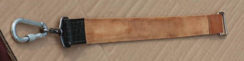 Ниже представляю на обозрение коллегам один из уже семи сделанных мною ремней. Склеил я его довольно давно, но довел до ума только сейчас. Ввиду особенностей кожи его пришлось шлифовать шкуркой начиная с зерна 0.6 мм. Финиш - шкуркой 2500. Размеры рабочей части - 40х380. В конце концов кожа показала себя очень даже хорошо. Вообще я чаще всего пользуюсь именно подвесным ремнем.