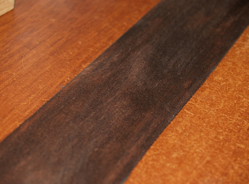 Re: Изготовление ремней для правкиРешил изготовить пастированный ремень по принципу "кожа на доске". Кожа под пасту вроде как не принципиальна, поэтому взял черную шору, которая была в хозяйстве. Слегка шлифанул ее наждачкой 600. Стал наносить красный диалюкс (везде написано наносится легко), а он как то не особо здорово наносится. То есть вроде и наносится, но неравномерно. Пробовал растереть тряпкой. Почти оттер всю пасту с ремня ) Нанес снова, попробовал растереть уже тряпкой с норковым маслом. Размазывается значительно лучше, но если много тереть, опять же паста вся в тряпке остается. На фото результат трех таких итераций.