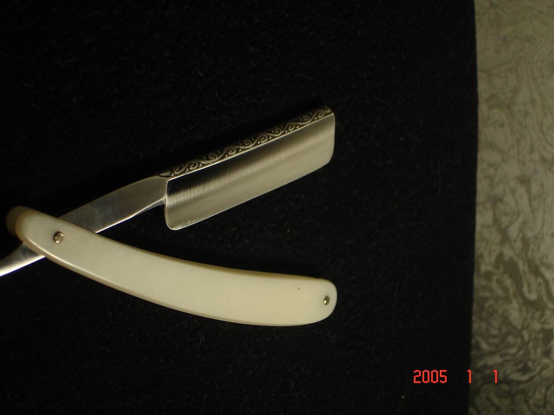 Скорее всего бритва в пользовании не была ,заводская шлифовка , бритва была разобрана , отполирована , ручка восстановлена , дополнил конструкцию шайбочками на осевом пине , что бы избежать трения ручки о полотно бритвы .