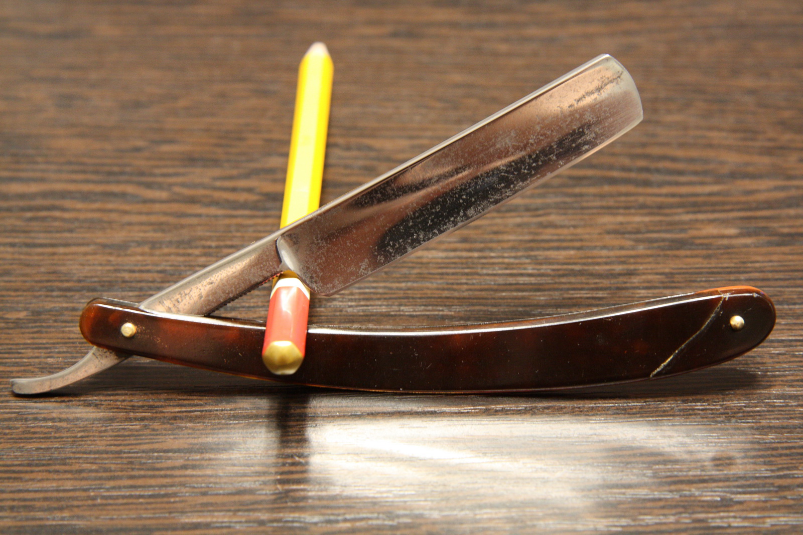 Опасная бритва №7, завод СТИЗ, 1951 год. Ширина полотна 14.5 мм, без футляра. Изначально полотно было с коррозией (после чистки полотно приобрело вид "матовые облака"), фаска вышла широкая, клинок ходит с усилием (лучше уж, чем болтается). В связи с этими особенностями, стоимость бритвы максимально снижена, сама бритва сделана в сталинский период и сталь тут отличного качества, бреет хорошо, ручка красивая. Отличный вариант попробовать опасное бритье с минимальными вложениями. Цена - руб.