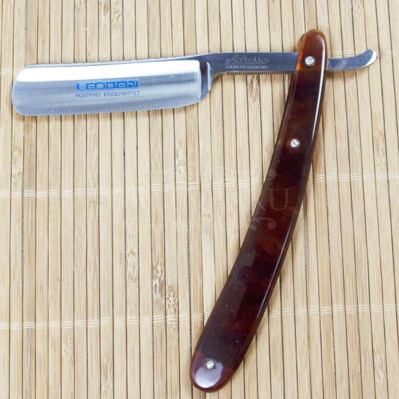 Ширина полотна 6/8", вогнутость 1/1, нержавеющая сталь Edelstahl, ручка из полупрозрачной пластмассы коричневая. Полотно украшено травлением: слово Edelstahl на синем фоне и ROSTFREI SOLINGEN (синим). На лицевой стороне эрля вытравлен логотип фирмы в виде слов ADRESSO SOLINGEN GERMANY. Спинка бритвы украшена травлением с цветами.
