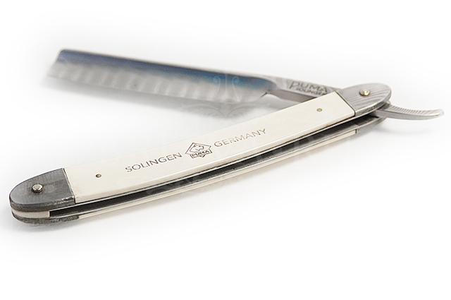 Режущее полотно выполнено из знаменитой своими замечательными режущими качествами Дамасской стали. Год выпуска бритвы - 2008. Ширина режущего полотна 5/8", вогнутость 1/1 (полная), головка бритвы имеет прямоугольную форму. Ручка укреплена металлическими основаниями. На ручке нанесены логотип PUMA между слов SOLINGEN GERMANY. На лицевой стороне эрля травление: PUMA solingen. На внутренней стороне эрля одной из 2х бритв этого артикула видны обозначения, выдающие происхождение заготовки этой бритвы: 2008 ... ROSTFREI. Связь между этими надписями и фирмой PUMA пока не установлена.
